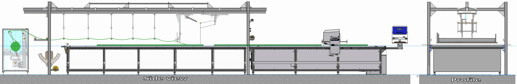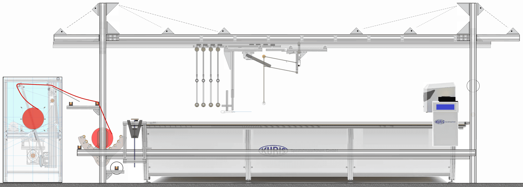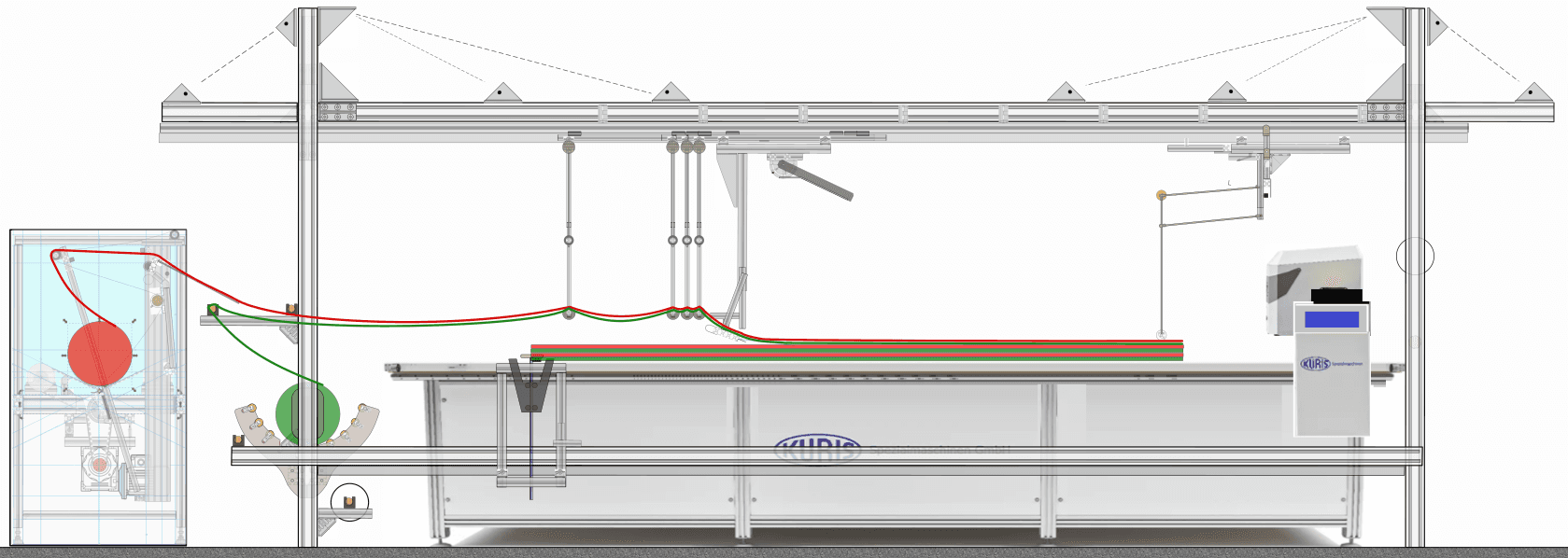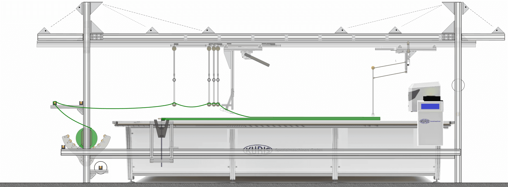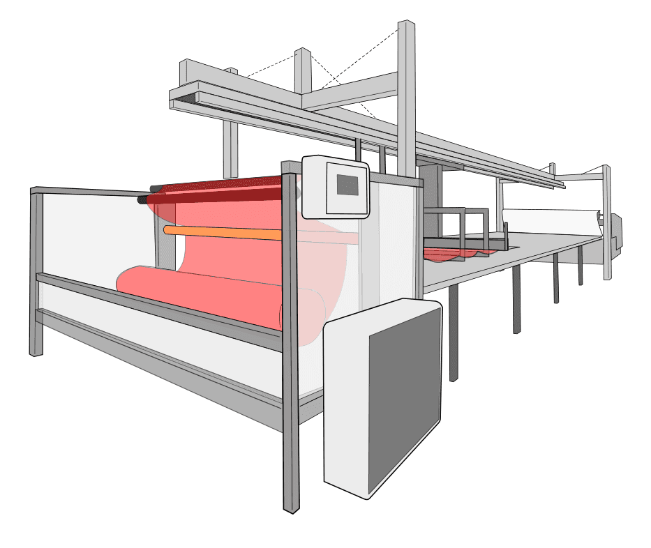 The textile handling concept is based on the principle of a telescopic conveyor that moves suspended beneath its track above the laying table.